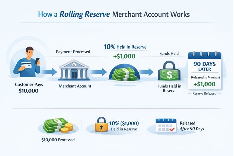 Instead of blocking all funds upfront, the reserve “rolls” over time. For example, if a provider applies a 10% rolling reserve for 90 days, 10% of each day’s processed volume is held and then released after 90 days — assuming no major issues occur.